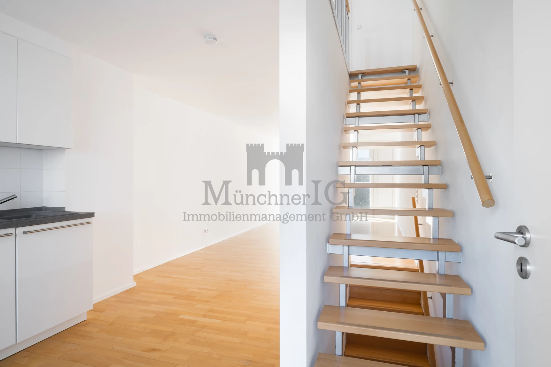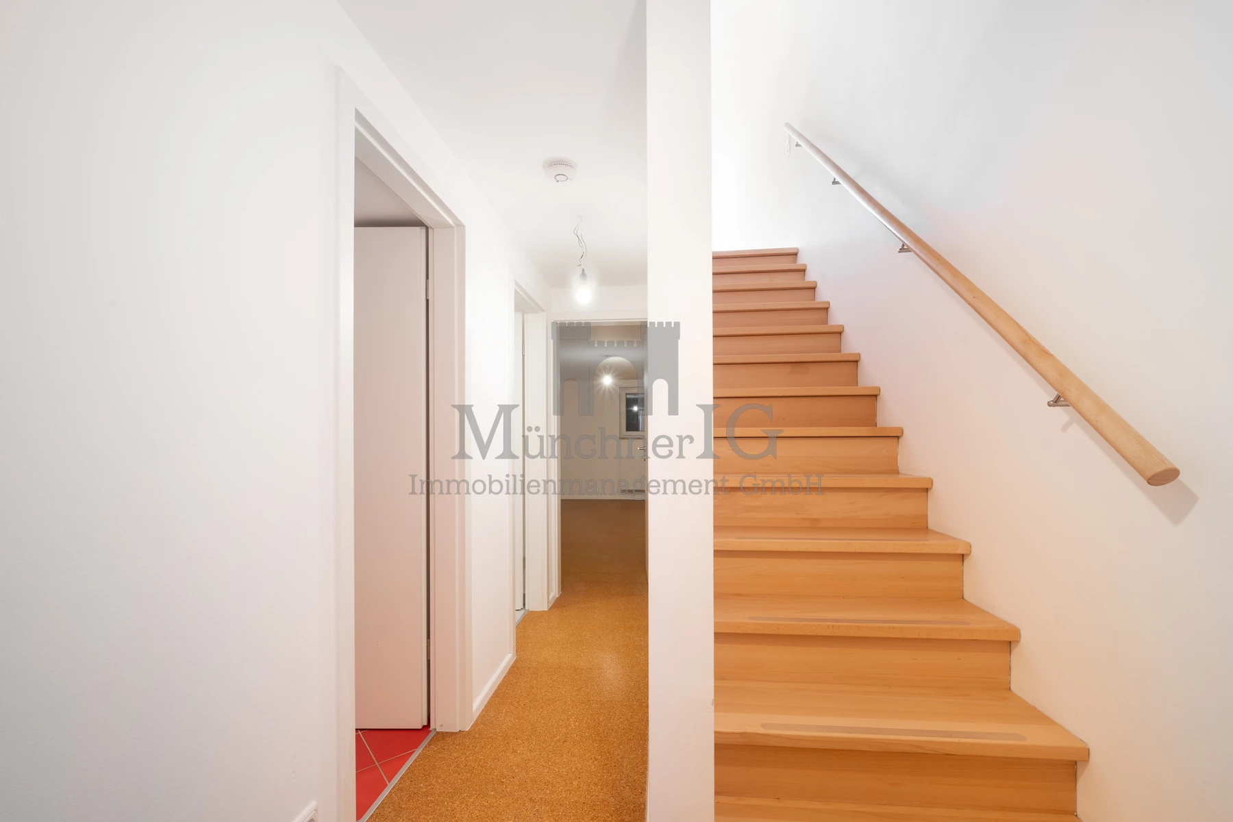 Die Verbindung der Ebenen wirkt offen und selbstverständlich. Die Treppe ist dabei kein trennendes Element, sondern Teil des Wohngefühls, das sich durch die gesamte Wohnung zieht.